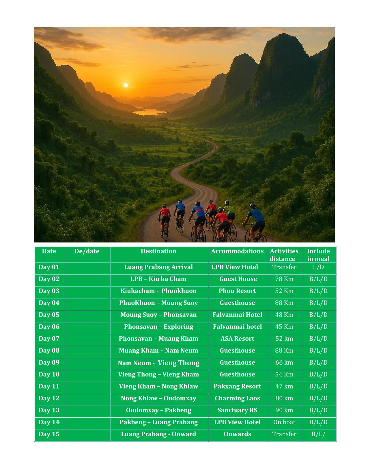 Embark on an unforgettable Northern Laos cycling tour with this expertly crafted 15-day Laos cycle itinerary, designed for riders seeking an immersive Laos adventure cycling tour. This fully supported guided cycling tour Laos begins with a scenic cycle tour from Luang Prabang, winding through some of the most breathtaking and culturally rich regions of the country. Experience the essence of a true Laos loop bike tour, pedaling from the ancient charm of Luang Prabang through the dramatic mountain landscapes and quiet rural villages of the Northern Laos bike loop. Highlights include cycling Luang Prabang to Phonsavan, exploring the enigmatic Phonsavan Plain of Jars cycling route, enjoying a peaceful Muang Kham bike tour, and the serene beauty of a Nong Khiaw cycling trip. Journey Oudomxay by bike, dive into a Vieng Thong cycling adventure, and finish strong with a memorable Pakbeng to Luang Prabang cycling segment. This Laos road cycling trip offers a mix of challenge and discovery, ideal for those wanting to explore Northern Laos by bicycle. Whether you're looking for the best 15-day cycling tour in Laos, scenic bike routes Northern Laos, or a unique Laos countryside cycling experience, this itinerary delivers. Ride through untouched terrain, enjoy mountain biking Northern Laos, and connect with local communities on a remote village cycle tour Laos. With its diverse terrain and rich cultural heritage, it's perfect for travelers interested in cycling through Laos hill tribes, discovering Laos highlands bike tours, and those seeking an off-the-beaten-path Laos bike tour. This comprehensive Laos multi-day bicycle itinerary is ideal for cyclists who value eco-tourism in Laos, cultural tours Laos, and active holidays in Laos. Perfect for slow travel in Laos, this tour is more than just a ride—it's a curated Laos adventure travel experience. If you're researching how to plan a bike tour in Laos, or searching for exciting things to do in Northern Laos, this journey delivers a unique perspective on Laos off-the-beaten-path travel. As part of a broader trend in cycling tours Southeast Asia, this experience also makes for an inspiring Laos road trip by bicycle—an adventure that’s as rewarding as it is unforgettable.