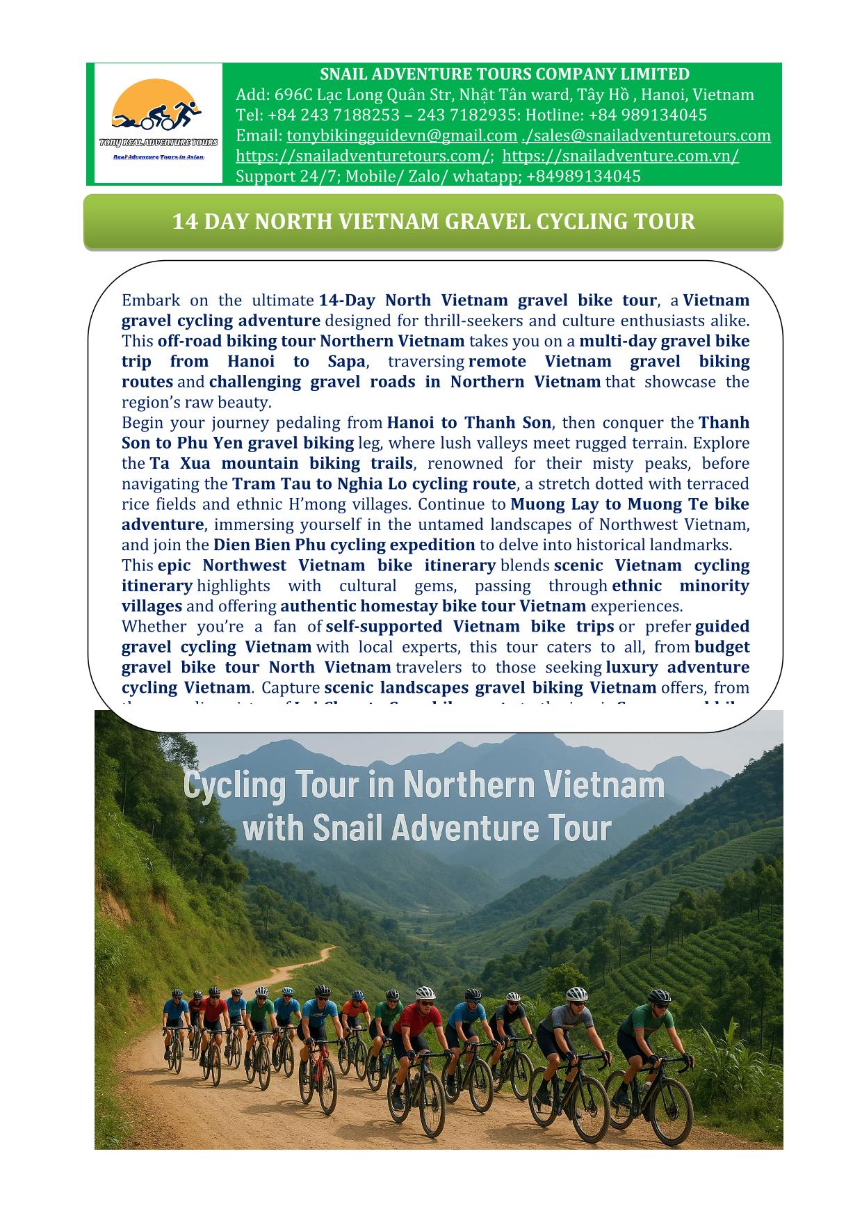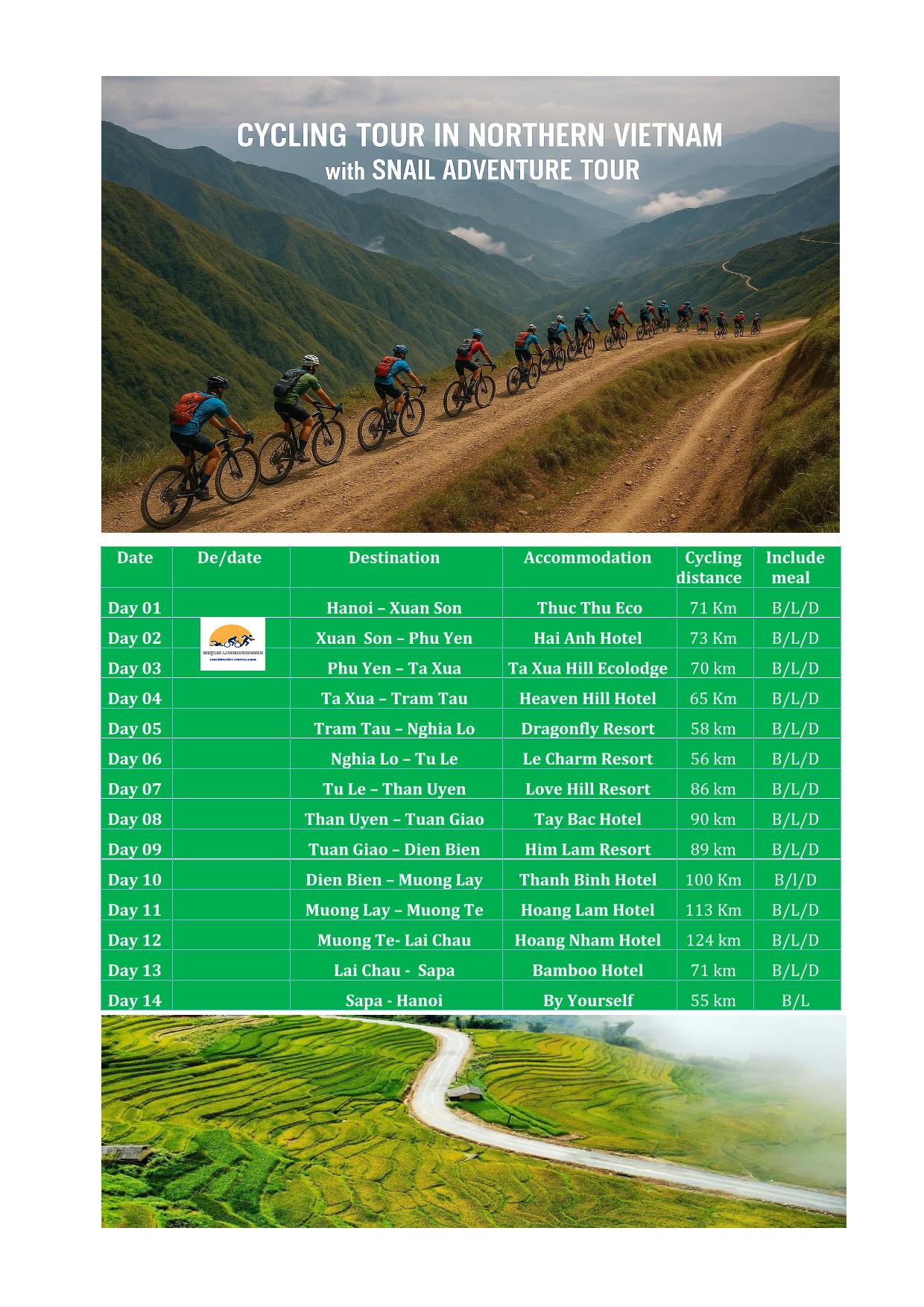 At Snail Adventure Tours, we believe every cycling tour in Vietnam (or any of our tours in Laos, Cambodia, and Myanmar) should be personalized to match the unique interests and preferences of each traveler. While the 14-day Northern VietnamGravel cycling adventure itineraries provided on our website are designed by our expert in-country management teams, we understand that true adventure is best when it is tailored to your needs.