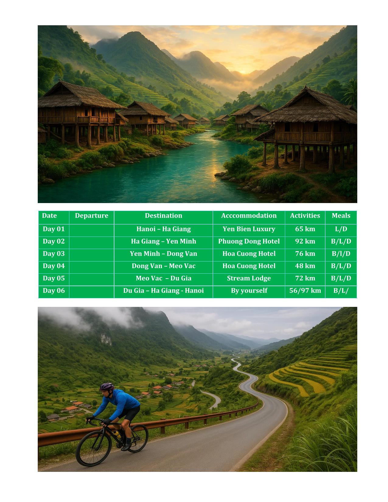In the evening, enjoy dinner and a relaxing overnight stay in Ha Giang. For those with limited time, there is an optional transfer to Hanoi available after lunch: a comfortable 5-hour journey via Tuyen Quang and Thai Nguyen, traveling on the newly built highway. Upon arrival in Hanoi, check in to your hotel and reflect on an unforgettable Northern Vietnam cycling tour.Thank you for joining us on this incredible adventure bike tour in Vietnam!